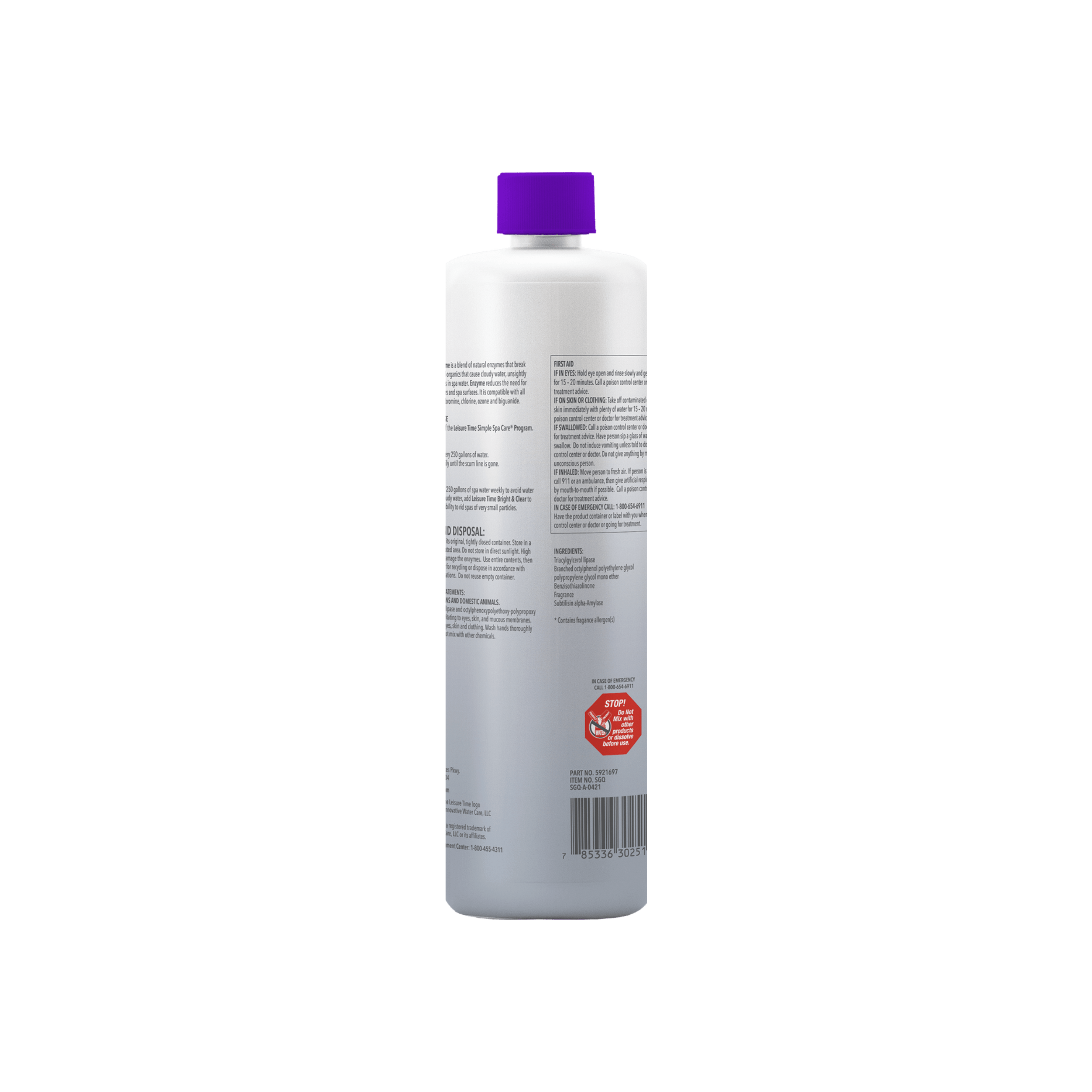 Leisure Time Enzyme is a blend of natural enzymes that break down oil, lotion, and organic contaminants that cause unsightly scum lines and odors in spa water. This product helps reduce the need for maintenance of filters and spa surfaces. Enzyme has been recently reformulated to provide stronger natural cleaning action. It is compatible with chlorine, bromine, ozone, and biguanide sanitizers.